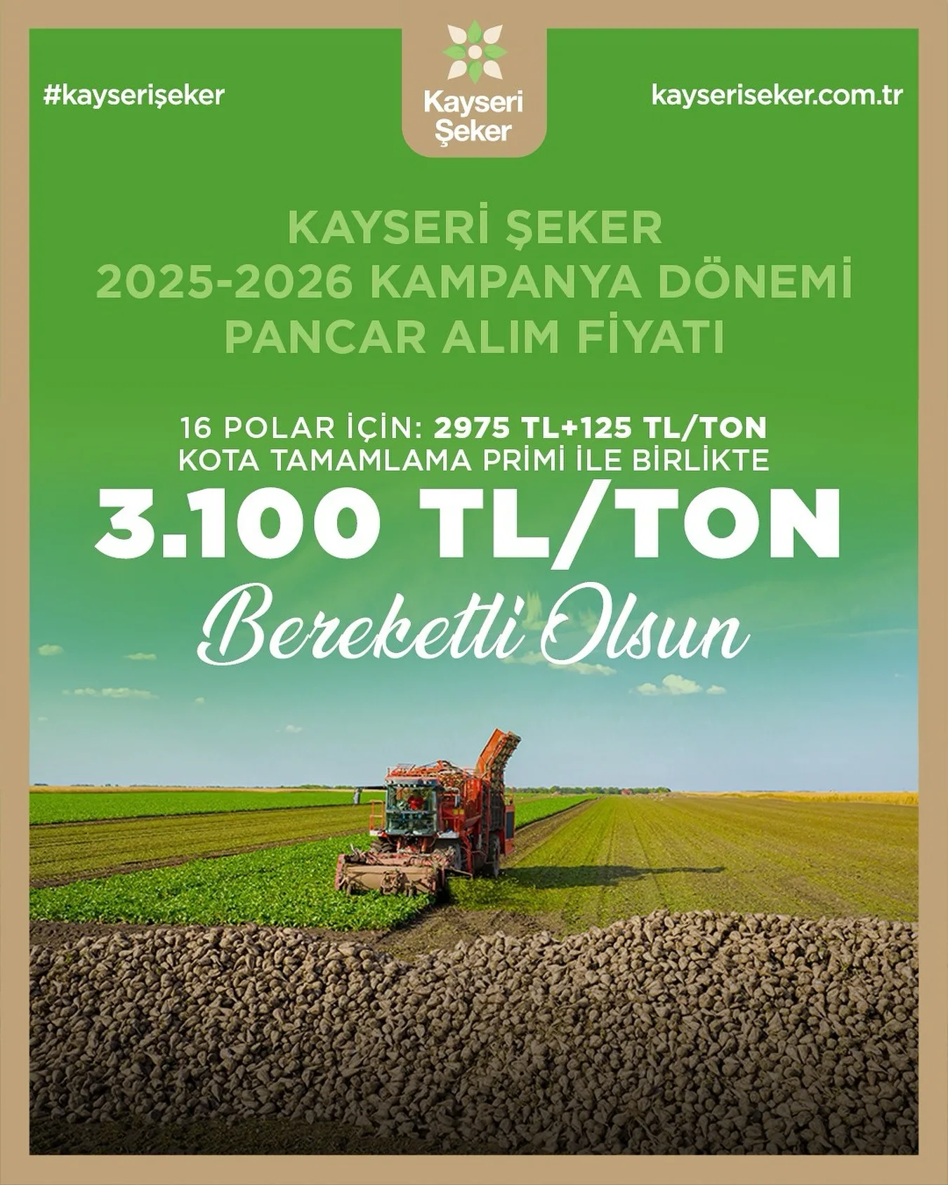 Kayseri Şeker Fabrikası, 2025–2026 kampanya döneminde 16 Polar pancar için alım fiyatını 2.975 TL/ton olarak belirledi, kota tamamlama primiyle birlikte toplam ödeme 3.100 TL/ton olacak.
