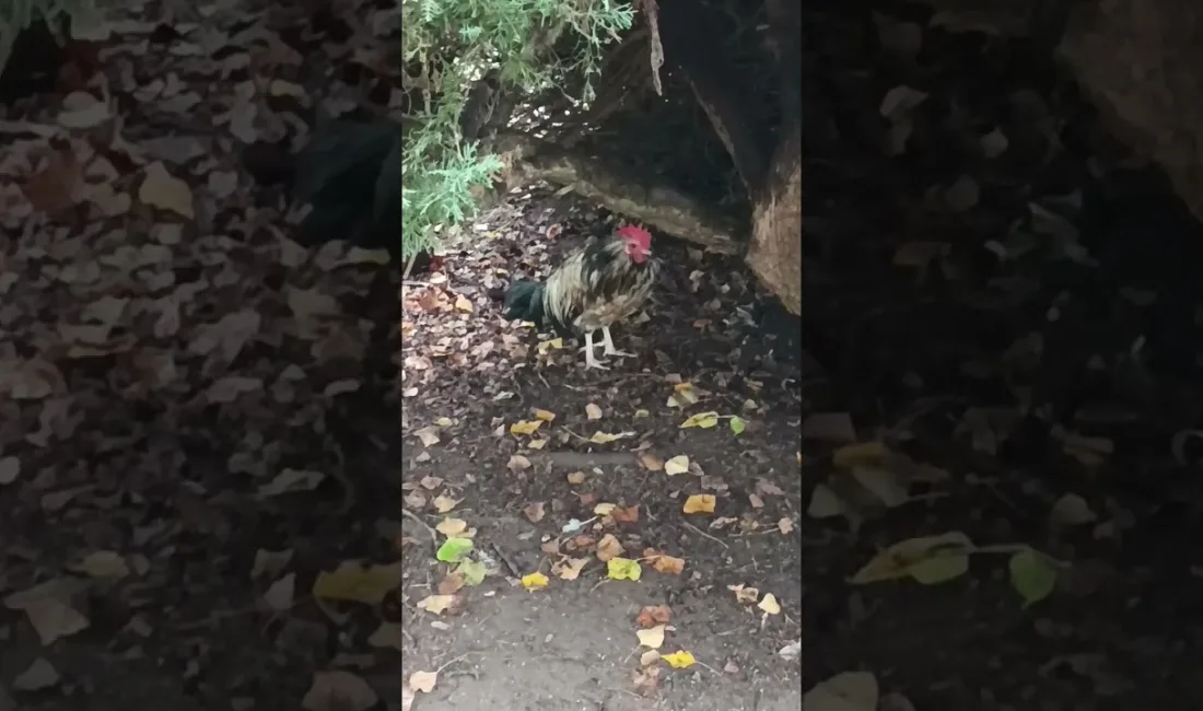 Arbustos y tobogán les sirven de refugio de la lluvia al gallo y a los pavos reales.