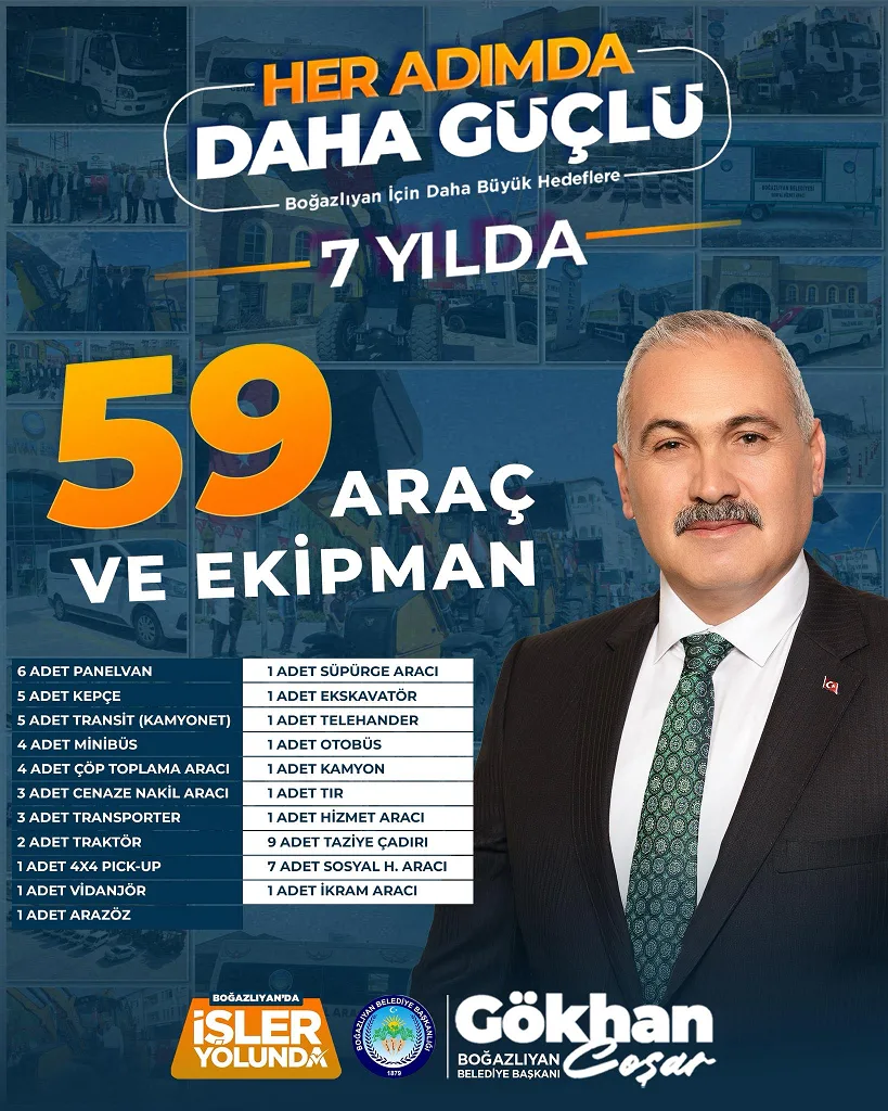 Başkan Gökhan Coşar açıklamasında, “7 yıl boyunca gece gündüz demeden çalıştık, üretmeye ve hizmet etmeye devam ettik. Bugün geldiğimiz noktada ilçemizin ihtiyaçlarına daha hızlı ve güçlü cevap verebilmek adına araç ve ekipman filomuzu büyüttük. Toplam 59 araç ve ekipman ile artık sahada daha etkin, daha hızlı ve daha güçlü bir hizmet anlayışıyla hemşehrilerimizin yanındayız. Birlikte başardık, birlikte büyümeye devam edeceğiz. Boğazlıyan’da işler yolunda.” ifadelerini kullandı.