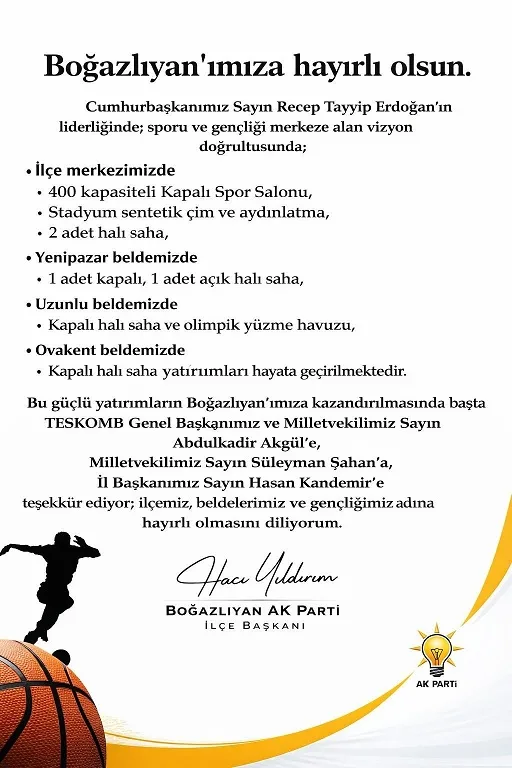 Hacı Yıldırım, söz konusu yatırımların Boğazlıyan ve beldelerinde gençlerin sporla buluşmasına büyük katkı sağlayacağını vurgulayarak, “Bu güçlü yatırımların ilçemize kazandırılmasında başta TESKOMB Genel Başkanımız ve Milletvekilimiz Sayın Abdulkadir Akgül’e, Milletvekilimiz Sayın Süleyman Şahan’a ve İl Başkanımız Sayın Hasan Kandemir’e teşekkür ediyorum. İlçemiz, beldelerimiz ve gençliğimiz adına hayırlı olmasını diliyorum” ifadelerini kullandı.