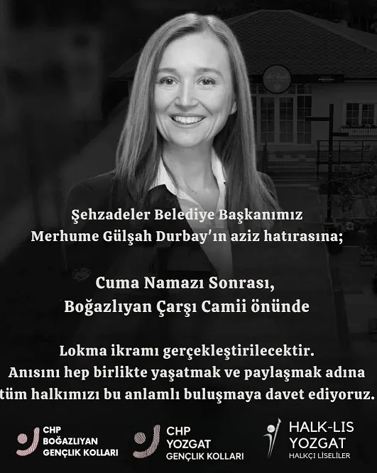 CHP Boğazlıyan İlçe Başkanı Mert Ertekin, merhume Şehzadeler Belediye Başkanı Gülşan Durbay anısına lokma ikramı düzenleneceğini açıkladı.